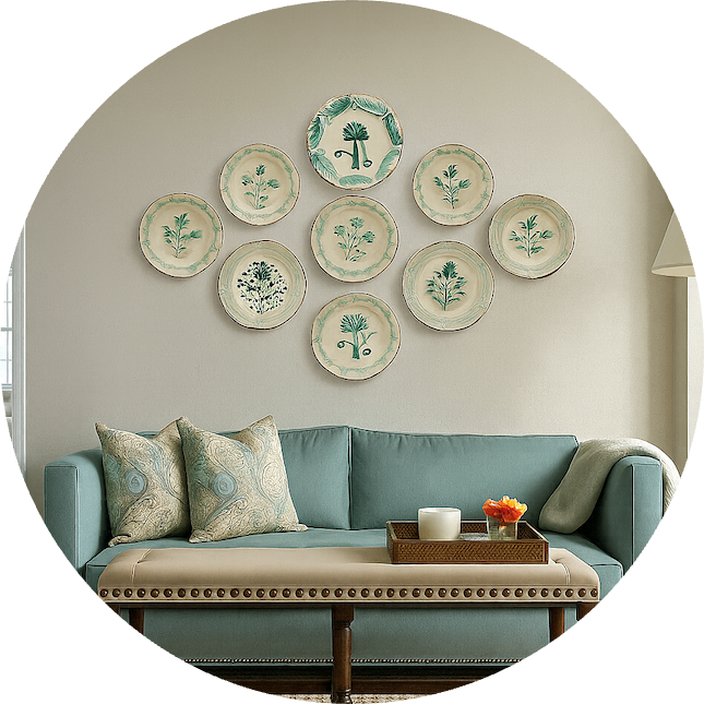 At my store, we have pieces made by global artisans that bring scale, design and texture to your wall. These pieces tell a story about the artist and their heritage. A pro tip that we love it incorporate is vintage plates sourced from your family, auctions or estate sales. Vintage plates bring history into the mix with old world charm.