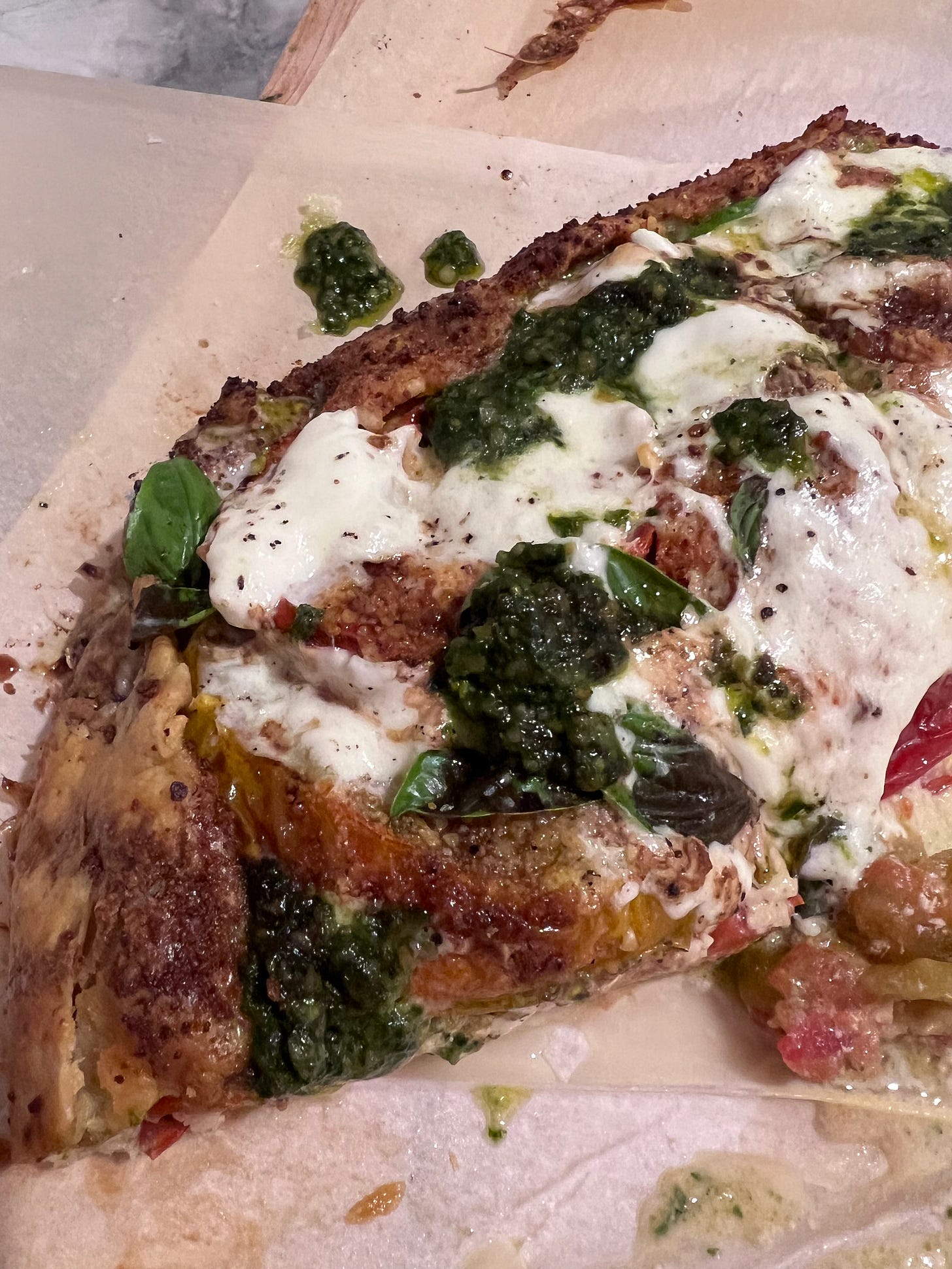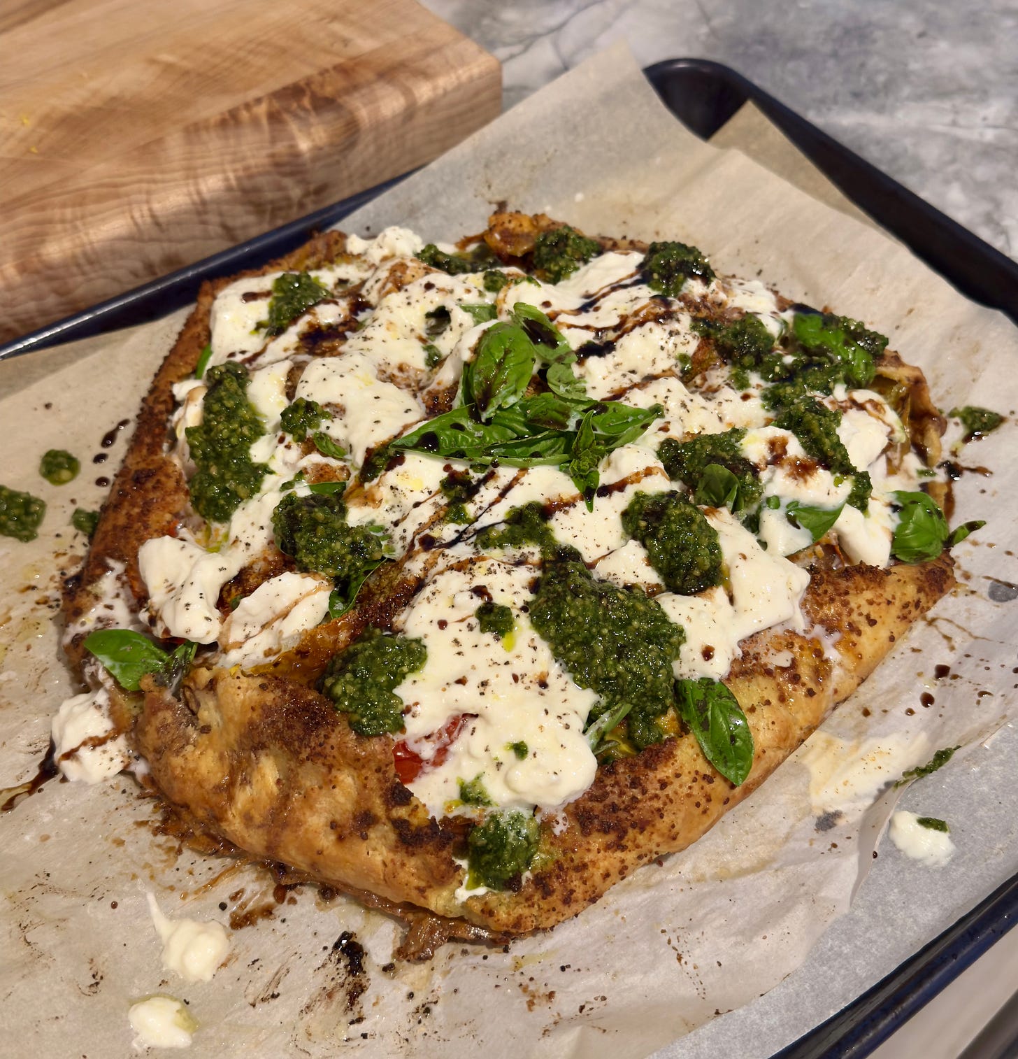 Oh My God, want to know what I am so HERE FOR? The Wishbone Kitchen Heirloom Tomato Galette. It might be the best thing I have eaten ALL summer! In Massachusetts, the tomatoes are peaking and my pots of basil are overflowing. In full disclosure, my son’s girlfriend prepped everything and then our plans changed because the oven wouldn’t heat up. So…. with everything ready to go, I only had to put it together. She made me homemade pesto with walnuts instead of pine nuts because Whole Foods was out of pine nuts (grrr) — and it was delicious. Here on the Cape, I do not have a rolling pin — will fix that today — so I used a cup to roll out the dough. Multicolored heirlooms made it pretty and oh so tasty. Lot’s of parm layered throughout and burrata on top.