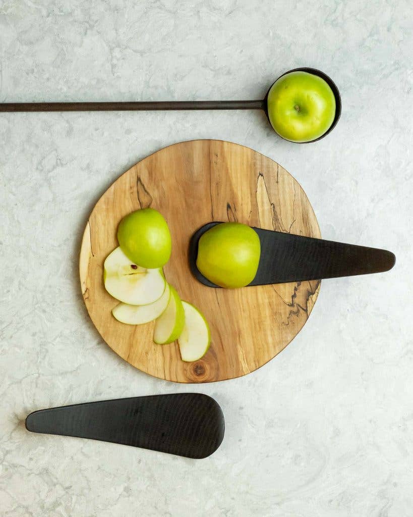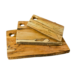 These boards are wonderful for cutting or serving and easy to display in the home. Our wooden cutting boards are made out of spalted maple wood. Maple wood is characterized by a smooth grain and unique light color. We upcycle fallen maple trees that are in the early stages of decomposition to get remarkable spalted lines running throughout the wood.