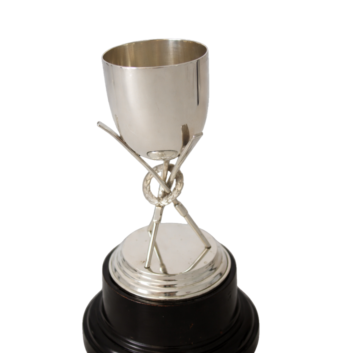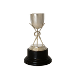 This .935 silver (sterling is .925 silver) was made by P. Orr& Sons Silver Co. The trophy is in 2 parts with an ebonized wooden base marked “Orr & Sons Silver Madras and Rangoon”. The silver top has a small cup on a pedestal of 3 Orrs with a laurel wreath center. The small cup would be perfect for cocktail picks. This fabulous trophy is in excellent condition for its age.