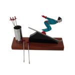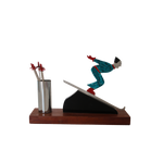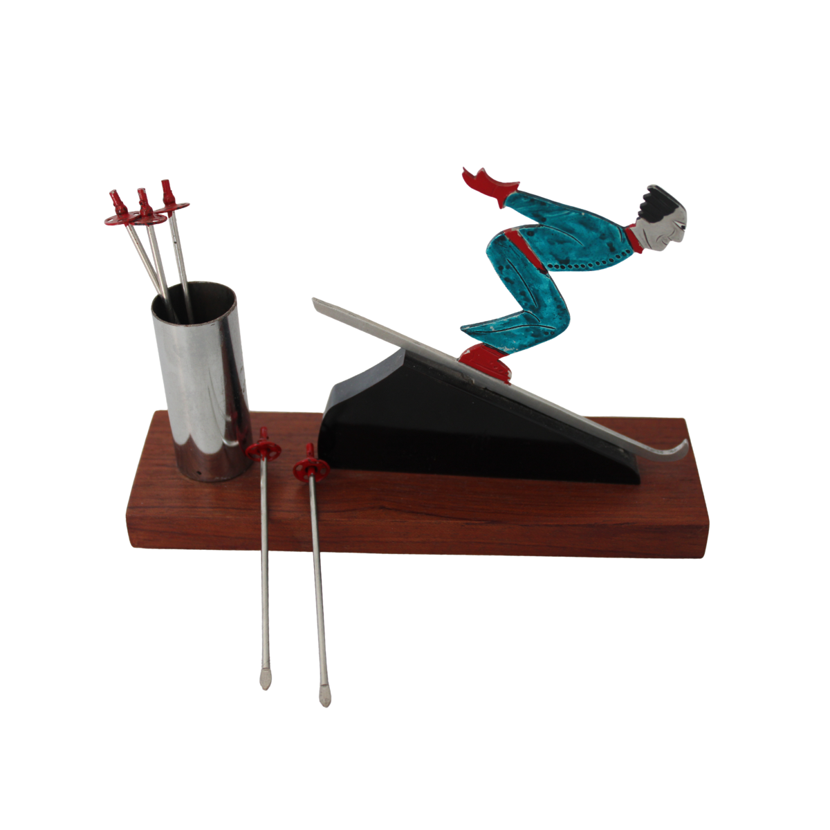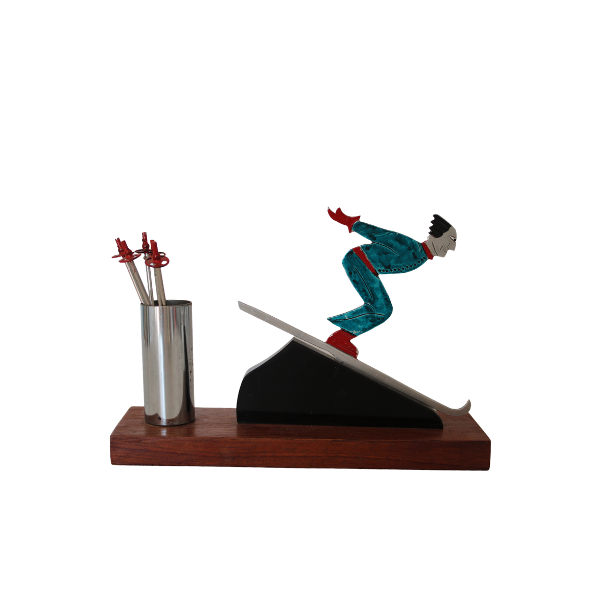 1930s, cocktail pick holder made by the french company Sudre. There is a skier/ski jumper made of hand painted metal on a wooden base. There are 5, ski pole shaped, cocktail picks in a small, chrome cup behind the skier on the wooden base. This is in good condition.