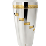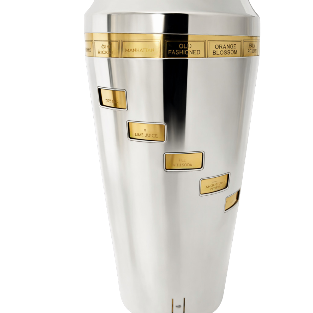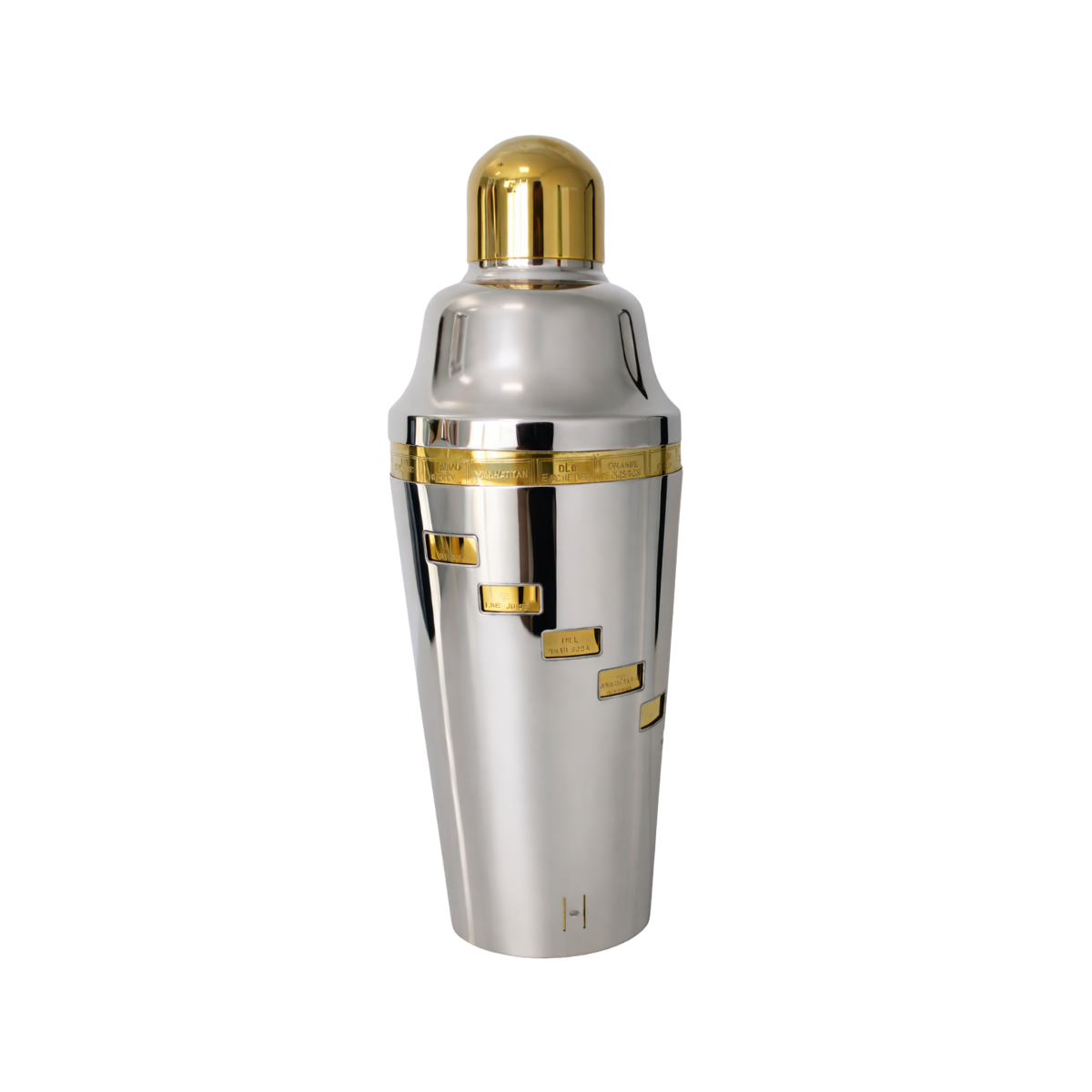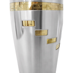 1930s, Napier, “Tells You How” cocktail recipe shaker. The outer silver plated part of the shaker has small windows cut into it so that when you spin it you see all of the ingredients of the cocktail listed on the top. The base of the shaker is 24k gold plated and has ingredients engraved upon it. The two part top has a silver plated strainer and a 24k gold plated cover. All of the silver plate and gold plate have been professionally replated in 100% silver and 24k gold. It is in excellent condition.