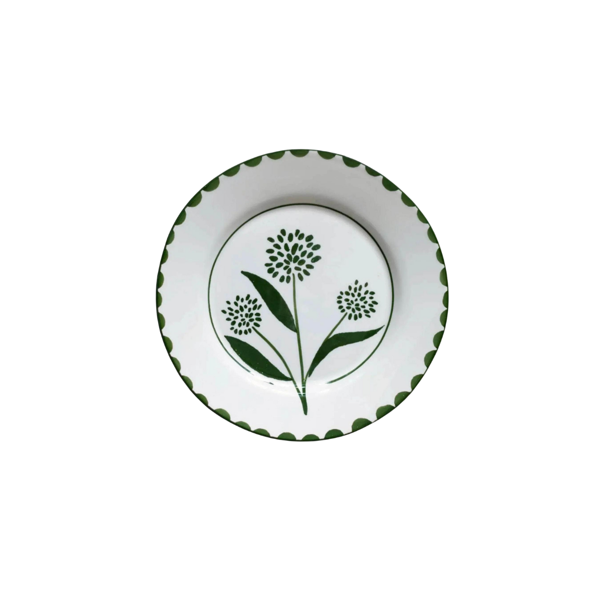 Elevate your dessert or side plate presentation with this pretty hand-painted plate. Featuring a sweet green dandelion pattern at its center, this plate is a work of art for your table. Handpainted, variations may occur. Made in Portugal
