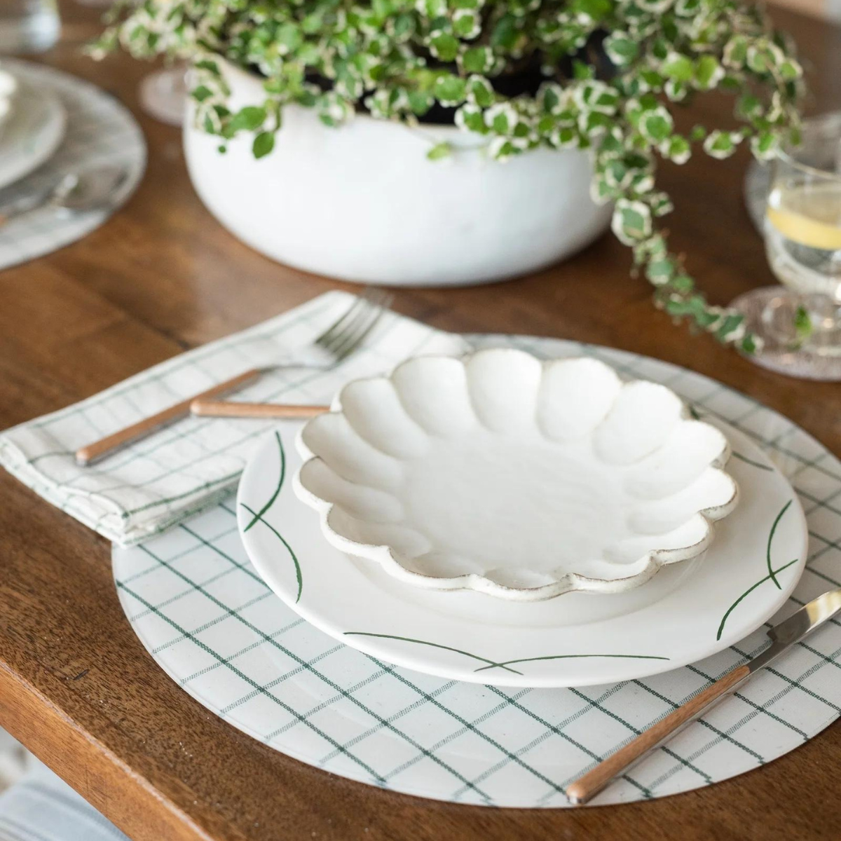 Great for any meal of the day! These placemats are as pretty as they are functional with their cream base and forest green windowpane design. Wipe clean with a soft cloth, soap and water. Not for use as a trivet. Made in the USA.