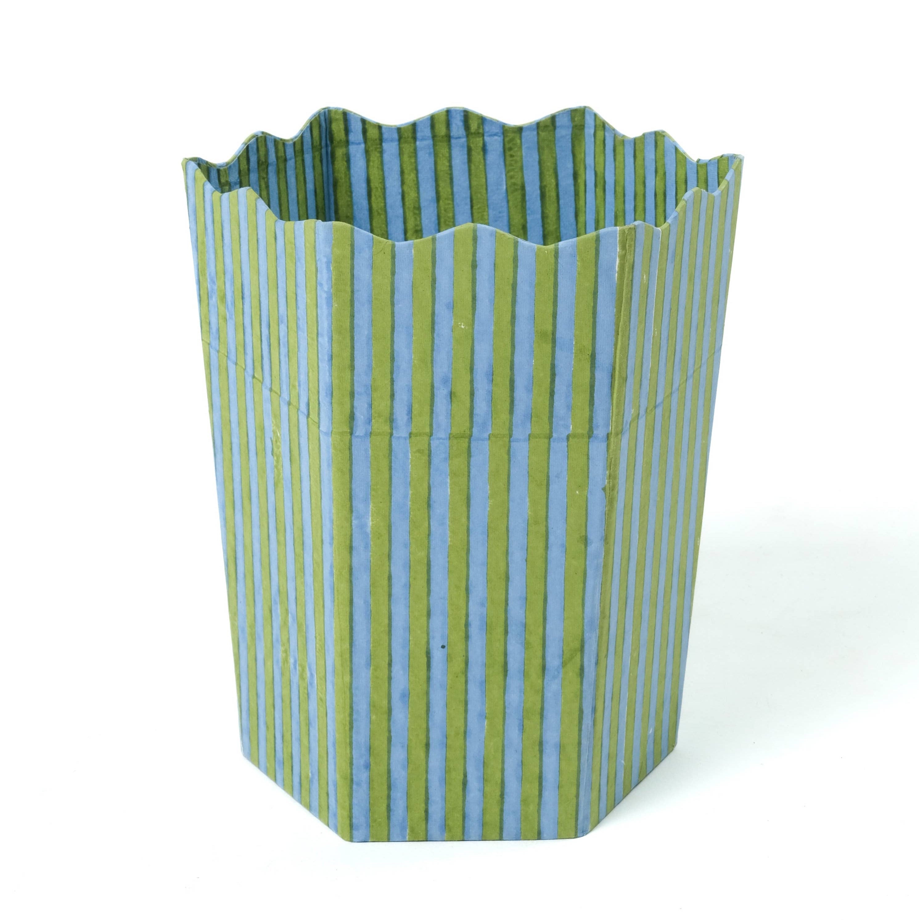 Crafted by skilled artisans, each scallop bin is a one-of-a-kind masterpiece. Made from 100% recycled cotton paper, it features a vibrant hand blockprint pattern and playful scalloped edges that bring a touch of artistry to any room. Designed to be as functional as it is beautiful, the bin can serve as a chic waste basket, magazine holder, toy organizer, or stylish storage for craft supplies.