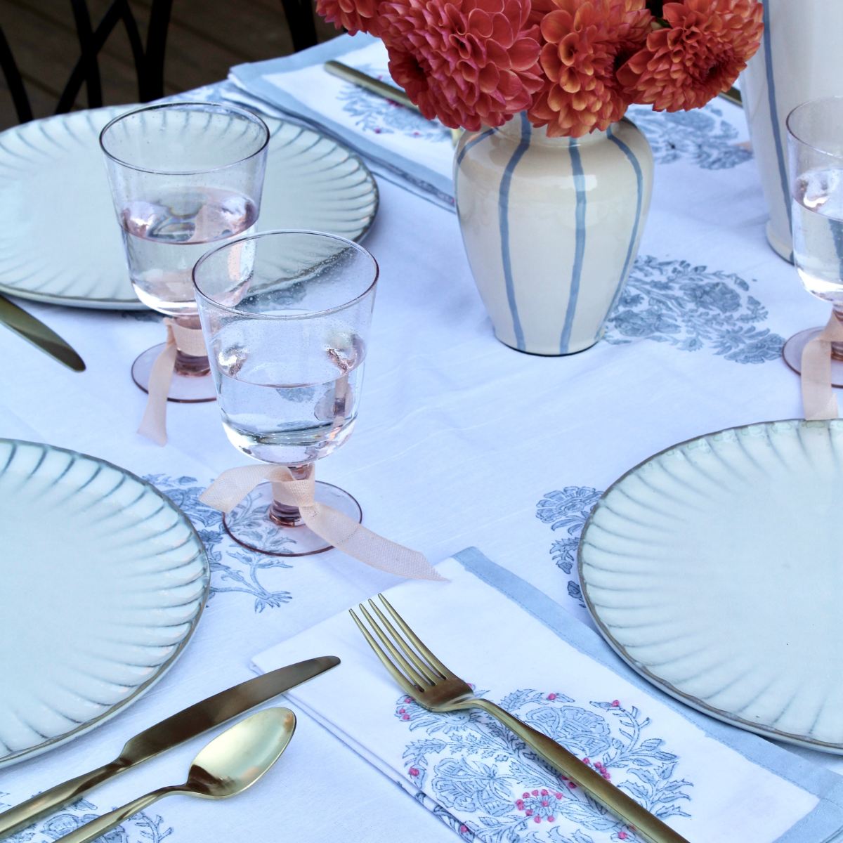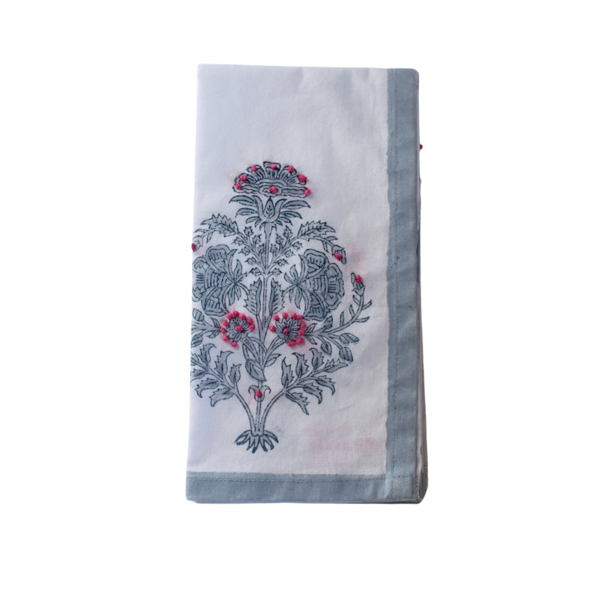 Napkin CRUSH! These pretty slate blue flower napkins have French knot hand embroidery details in hot pink. The soft blue of the napkins pair beautifully with a multitude of tablecloths and placemats. Handblock printed and hand embroidered in India.