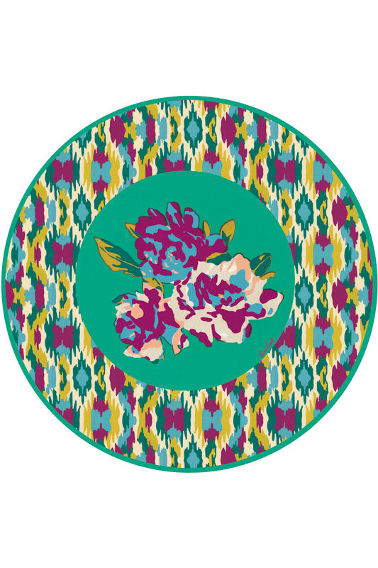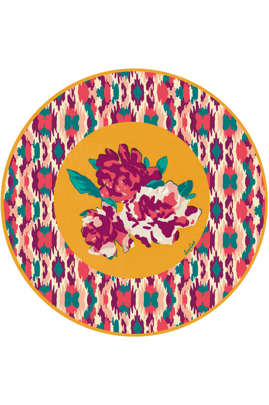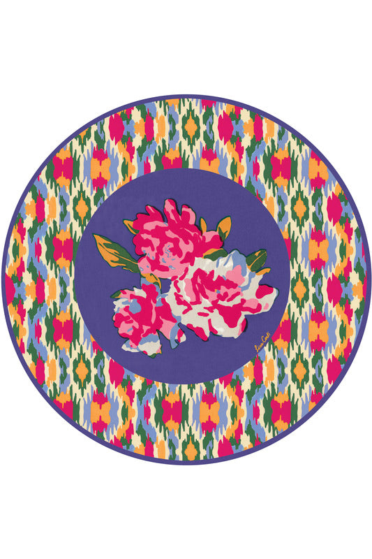 Inspired by Salvador Dalì, a large peony merges with Jaquikat, featuring multicolored geometric ikat and jacquard patterns, sublimation printed.