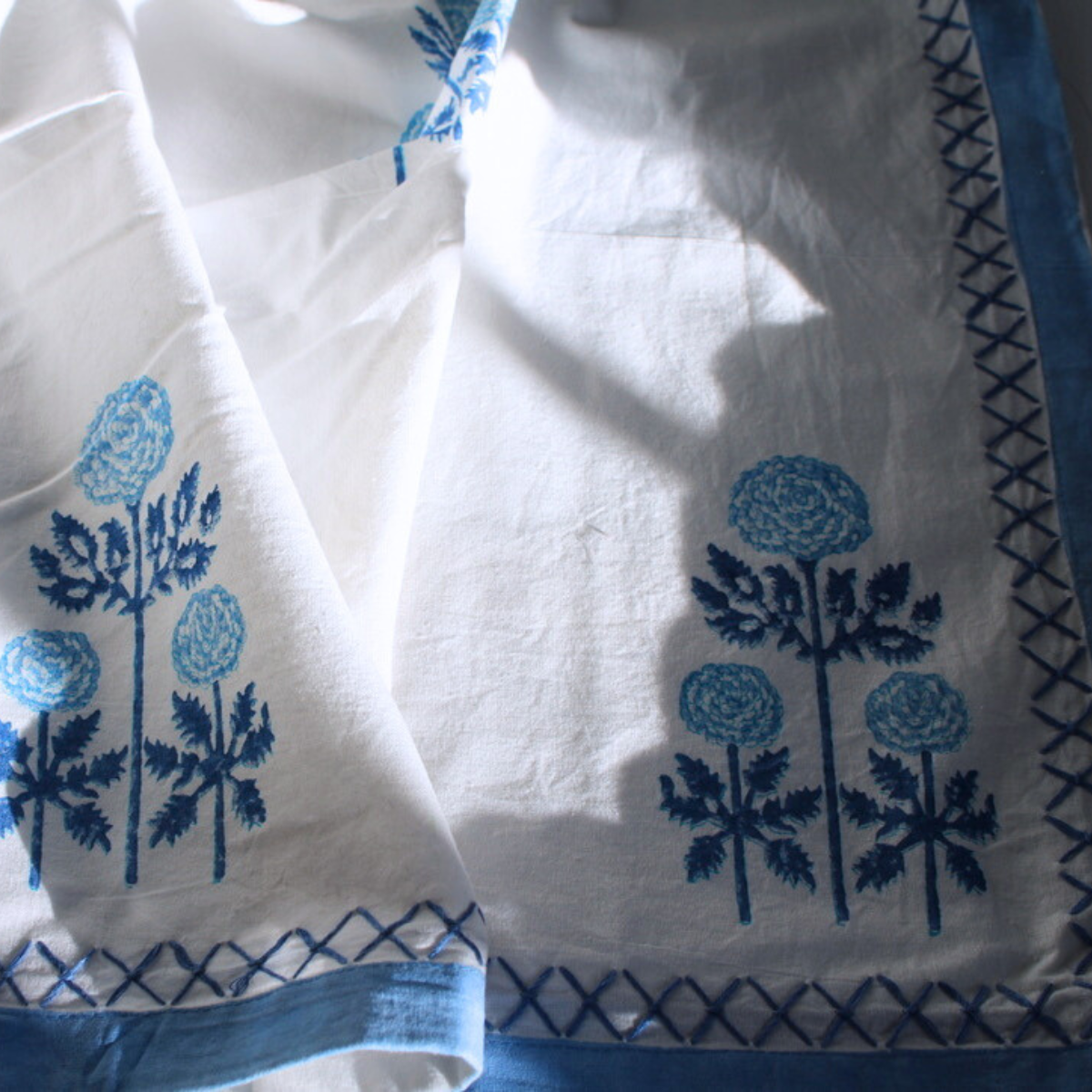 Transport yourself to the Greek isles with this gorgeous tablecloth. Beautiful floral design in the perfect shade of blue, reminiscent of vacations (or dreams) spent cruising the Aegean Sea. Handmade in India.