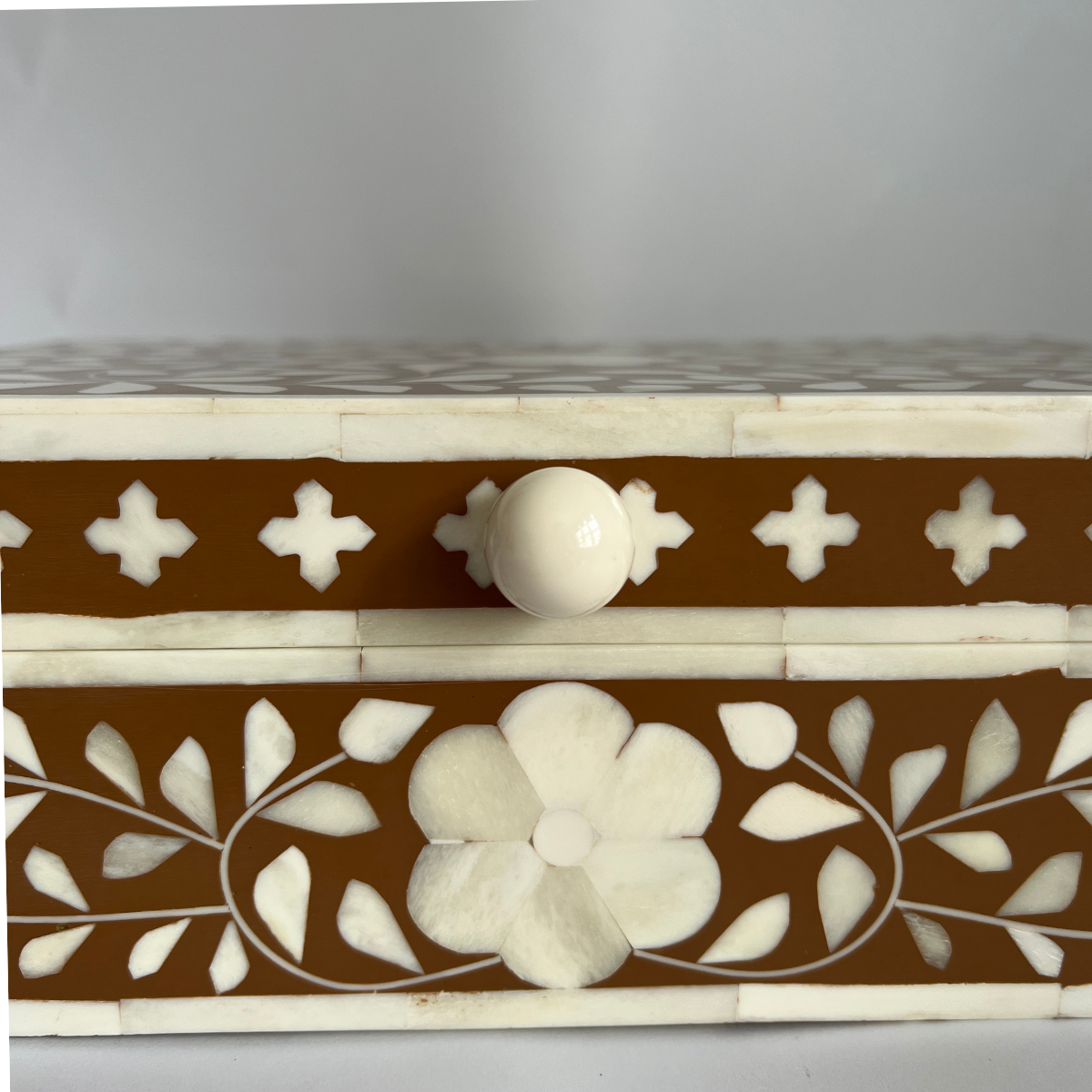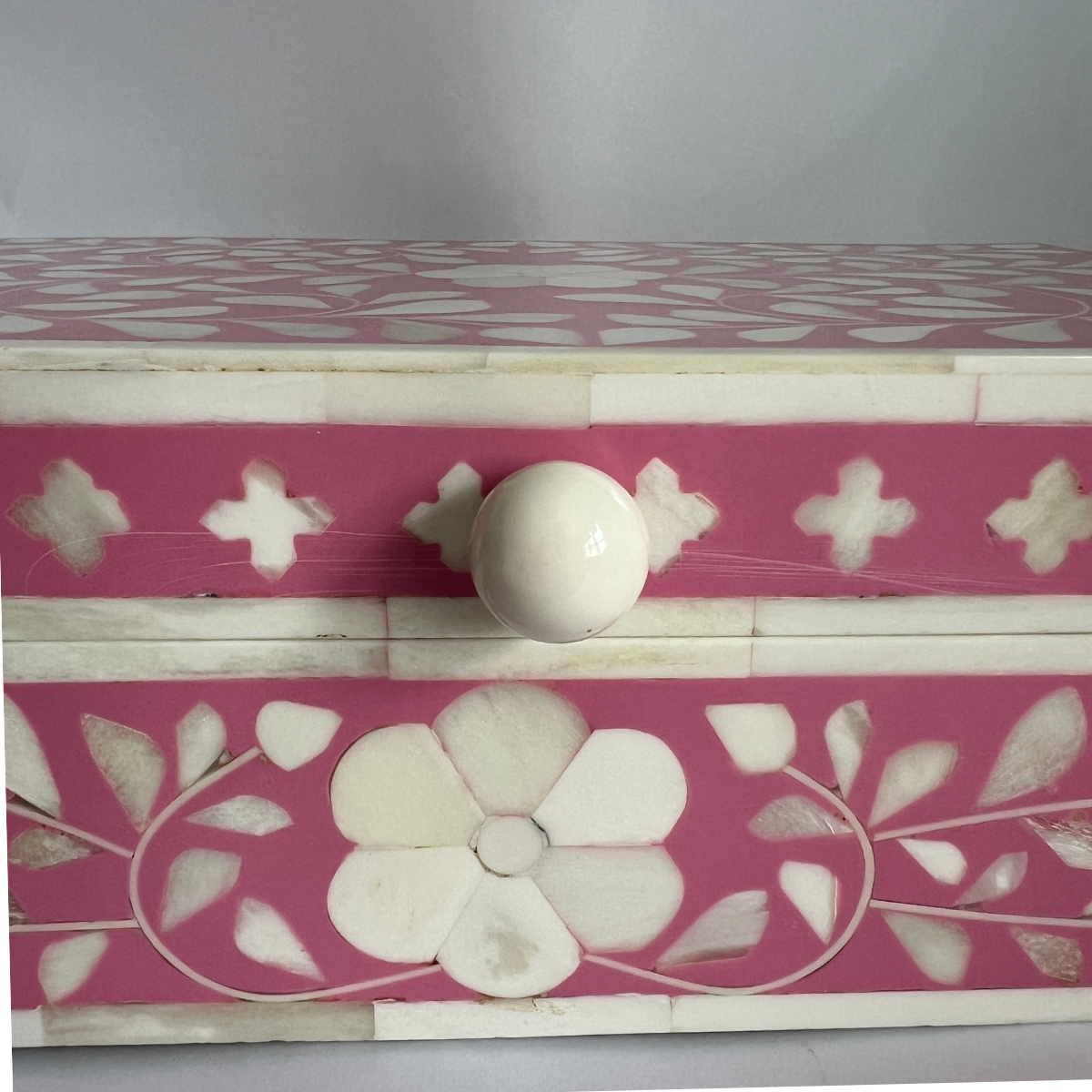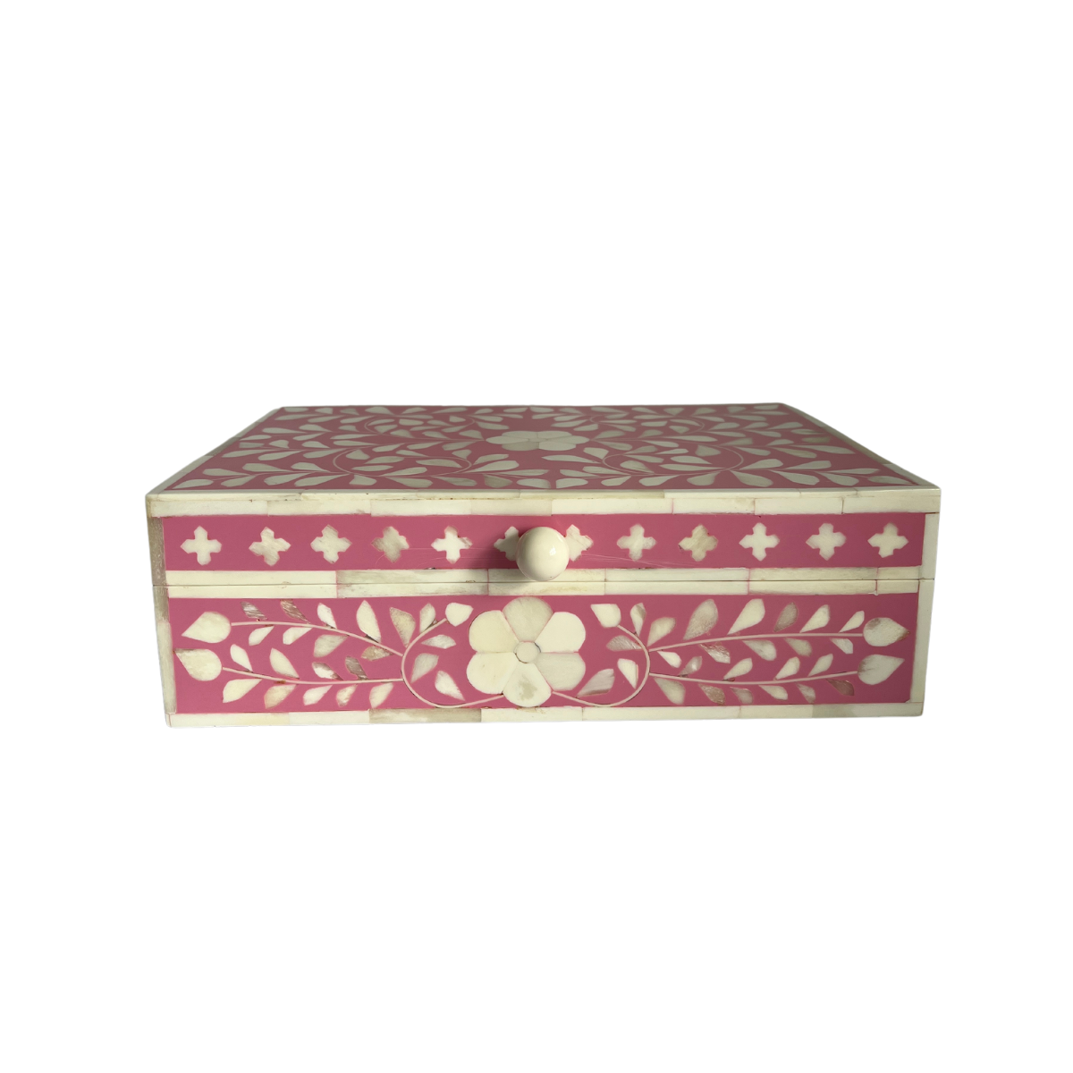 Organization but make it chic! This expertly crafted bone inlay box makes a striking addition to a desk, vanity, or tabletop. Use it to hold jewelry, office accessories, or your favorite mementos. Custom made just for us, this box has a pretty pink or brown background with bone-inlaid flowers and geometrics. Also looks fabulous on bookshelves.