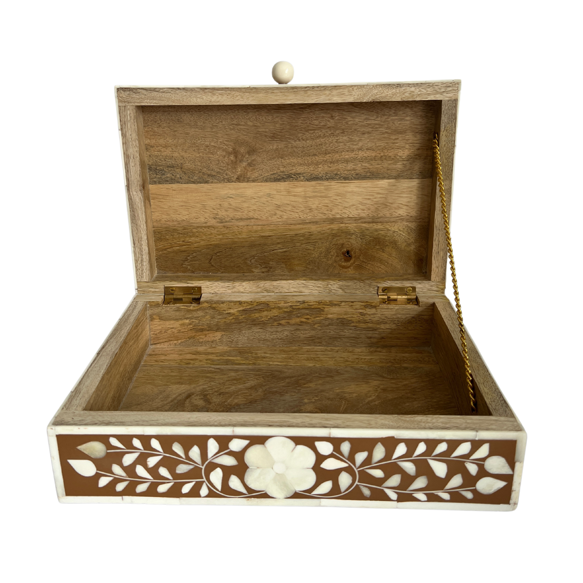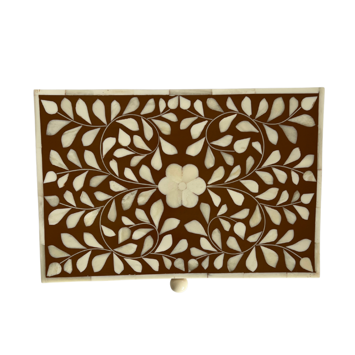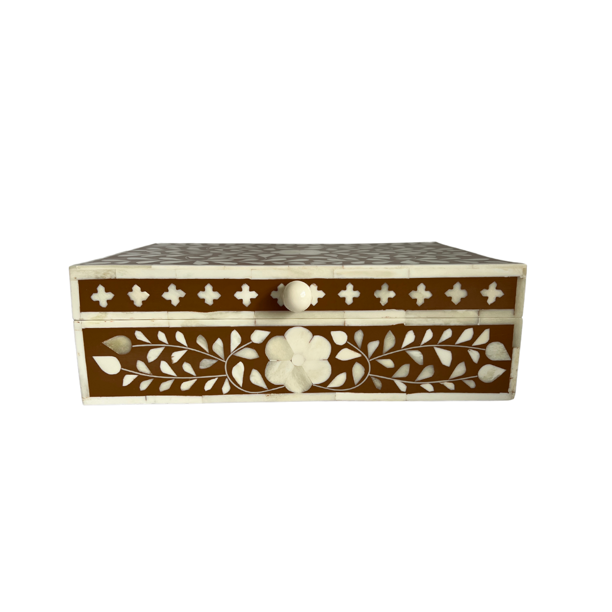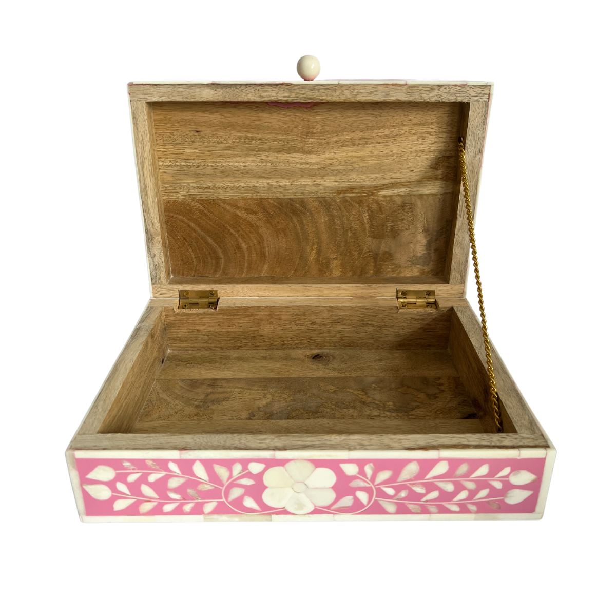 Organization but make it chic! This expertly crafted bone inlay box makes a striking addition to a desk, vanity, or tabletop. Use it to hold jewelry, office accessories, or your favorite mementos. Custom made just for us, this box has a pretty pink or brown background with bone-inlaid flowers and geometrics. Also looks fabulous on bookshelves.