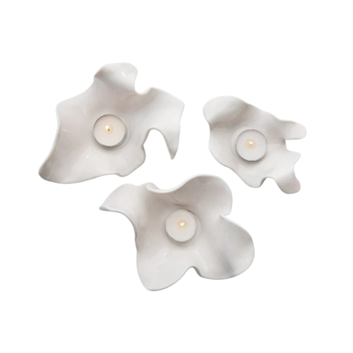 Contemporary and elegant, these totally one-of-a-kind tealights add all kinds of style to your dining table. You would never know it, but they are inspired by the old colonial candlesticks, pre electricity, that had a handle & guided you through dark hallways at night. You'll find that most of these tealights have a sort of hook on one end so you can carry them in much the same way! You won't find anything like them, anywhere else! Shapes and dimensions vary wildly.