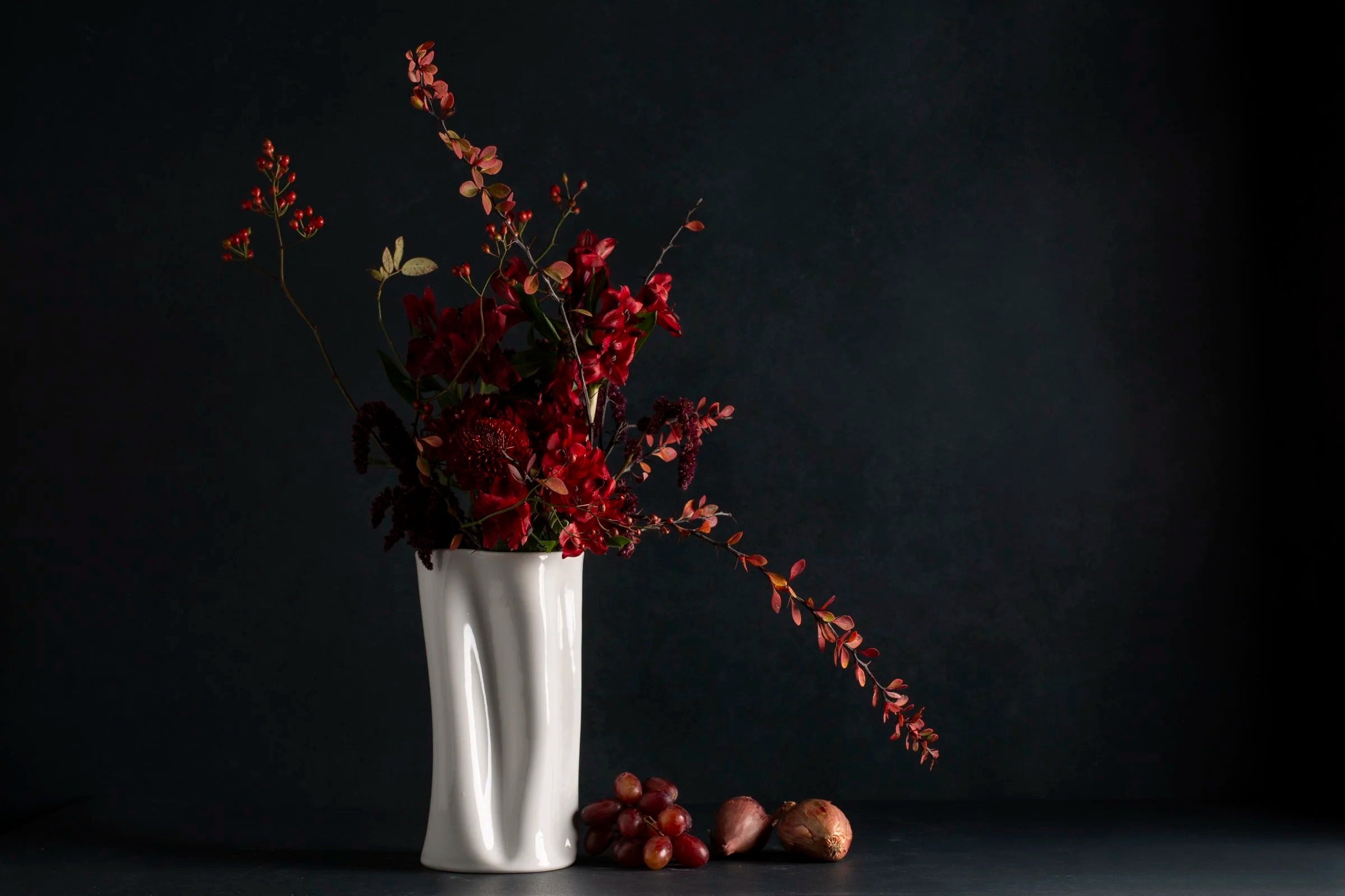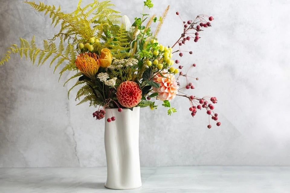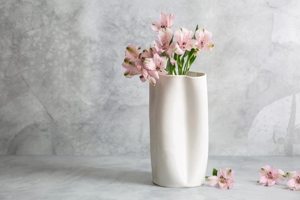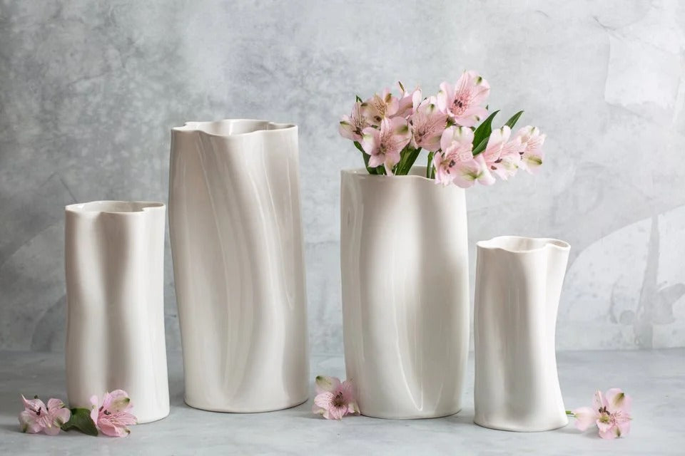 Classic yet contemporary, the Flutter Vase balances refinement with organic movement. Its sensuous silhouette and gently undulating surface catch the light beautifully from every angle. Handmade from porcelain and finished with a glossy white glaze, each piece is entirely unique and designed to stand alone as a sculptural object or to showcase floral arrangements with quiet drama.