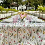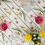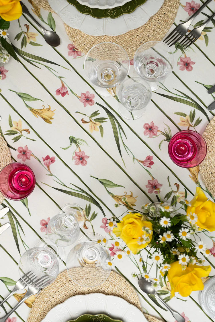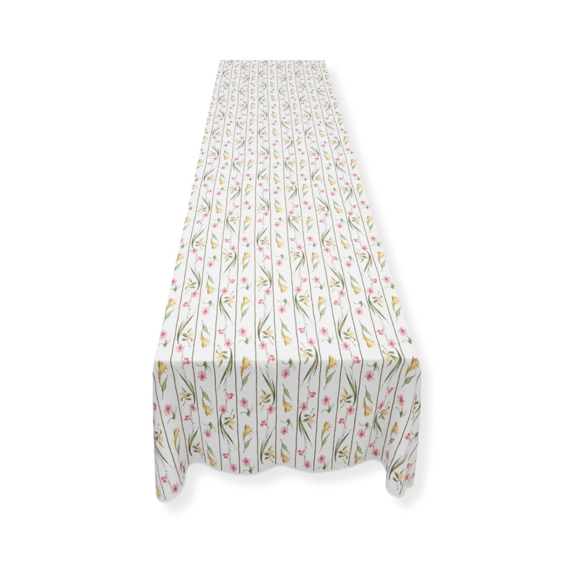 Symbolising strength and heartfelt emotion, the gladioli’s timeless beauty is reimagined with contemporary charm. Striped with delicate stems from top to bottom, the tablecloth strikes a perfect balance between softness and statement.