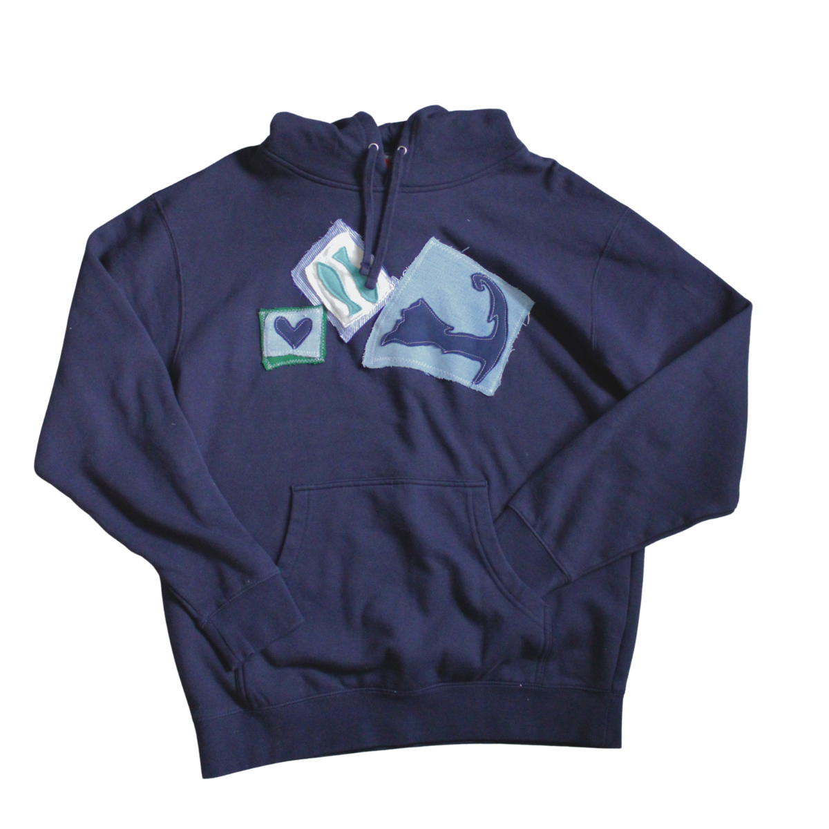 Made with love in Boston, these sweatshirts are one of a kind and handmade from upcycled materials. Our navy hoodie is layered with fun Cape Cod icons - a heart, fish and a map - cozy and CUTE!