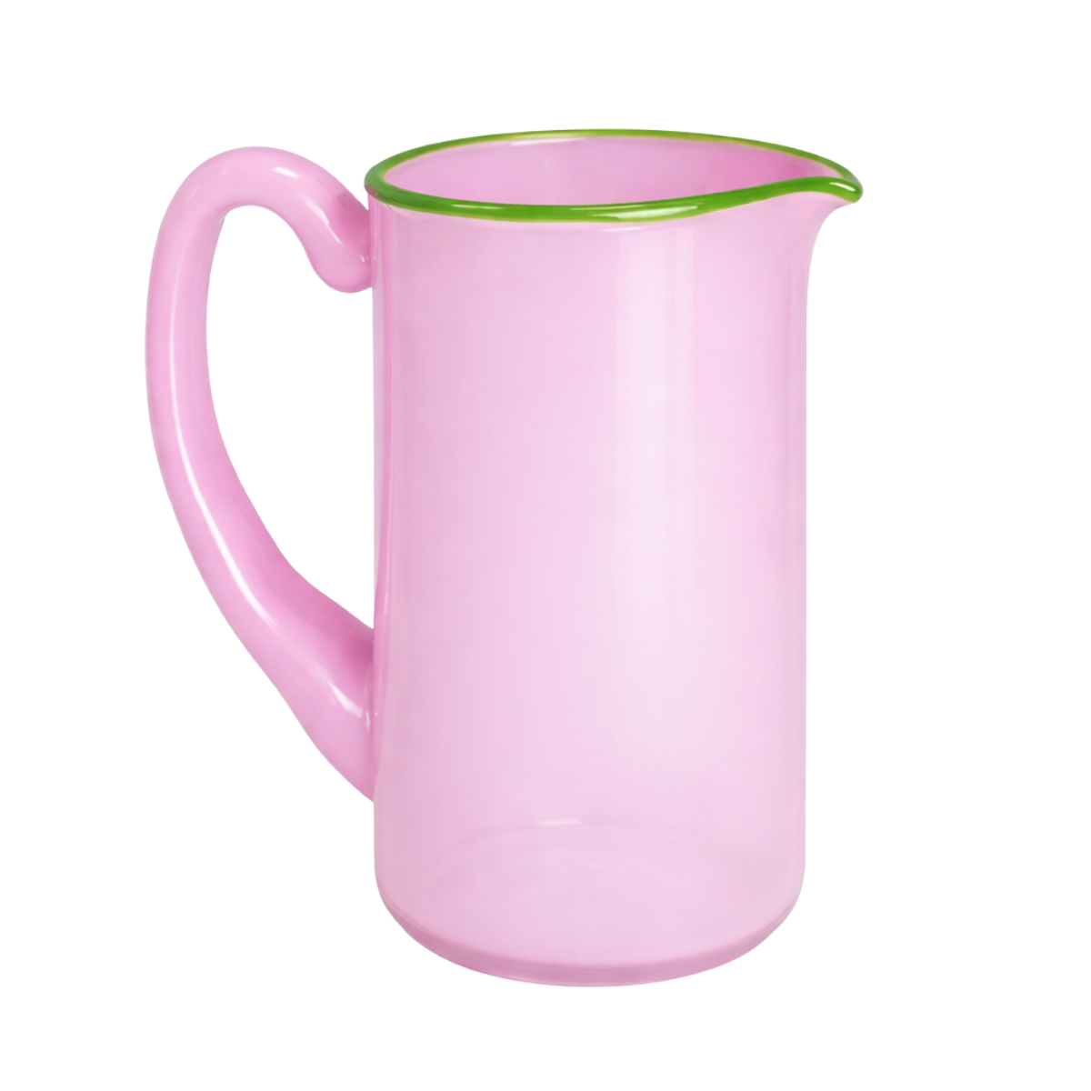 This handcrafted blown glass pitcher brings a playful yet polished touch to any table. Each piece is individually made, featuring a softly rounded silhouette and a subtly rimmed lip that adds a pop of contrast and charm.