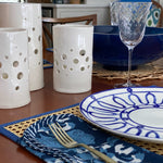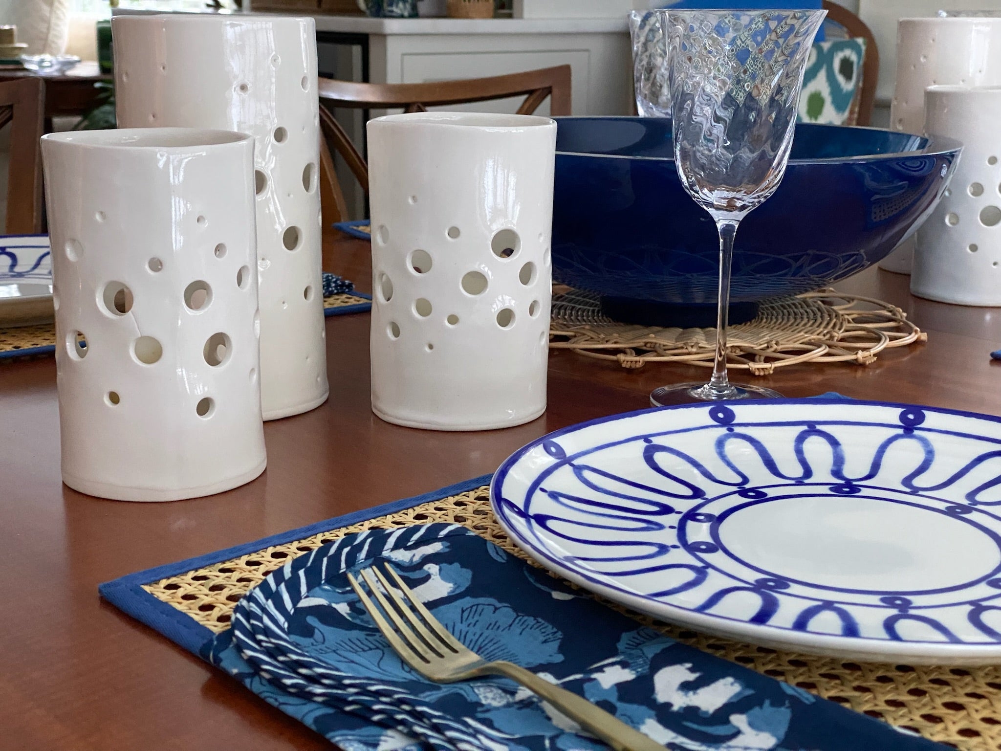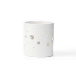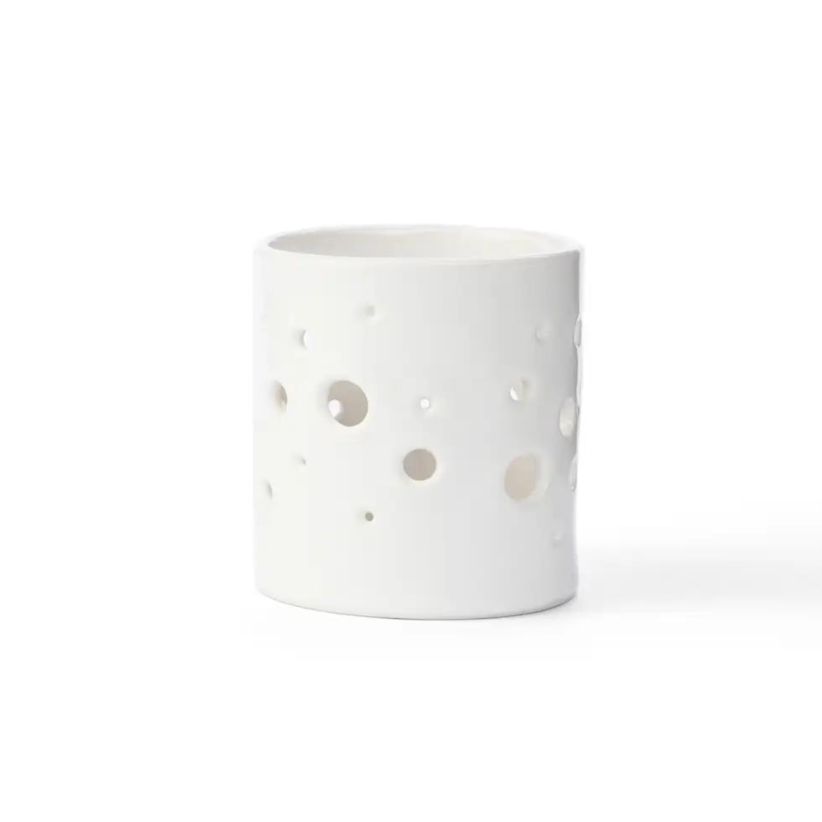 These beauties give off a warm glow that will add sophistication to any room or dining table. By far a best seller for the beautiful ambiance they add and the ability to fit in any decor from contemporary to country. They are handmade with porcelain and are always organic, never perfectly round and each one has its own unique pattern of holes. Finished with a gloss white glaze for a sleek and contemporary look.