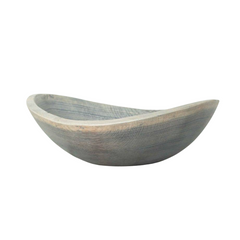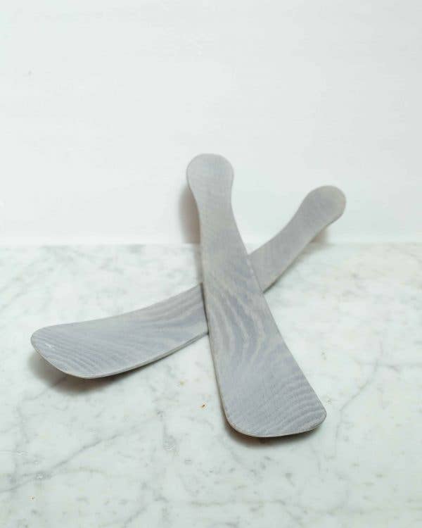 Sustainably sourced, upcycled, and handcrafted in New England from Oak logs. The Oak is dipped in a solution of steel wool and vinegar which stains the wood black. The black tossers are then painted with a food safe white milk paint that gives the finished product the bluish / greyish color tone.