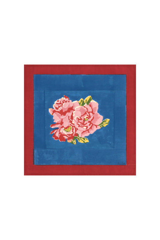 Known for her vibrant colors and stunning designs, Italian textile designer Lisa Corti draws inspiration for these rich tapestries from her childhood in Africa and travels throughout India. These rich, colorful textiles are Italian designed by Corti and hand printed by specialized artisans using an ancient block print technique in India. The bold Nina Rose design features a large flamed borders inspired by Balearic Telas de Lengua, and a central bouquet of three English-style roses, hand-printed with wooden blocks with a blue palette.
