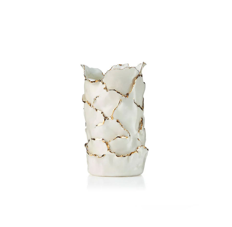 Add a playful touch to your decor with Petit Petal Ceramic Vase. Handmade with petal and gold edging, this vase is perfect for displaying your favorite blooms. And with a touch of gold luster along the edge, it's sure to add a touch of whimsy to any room.