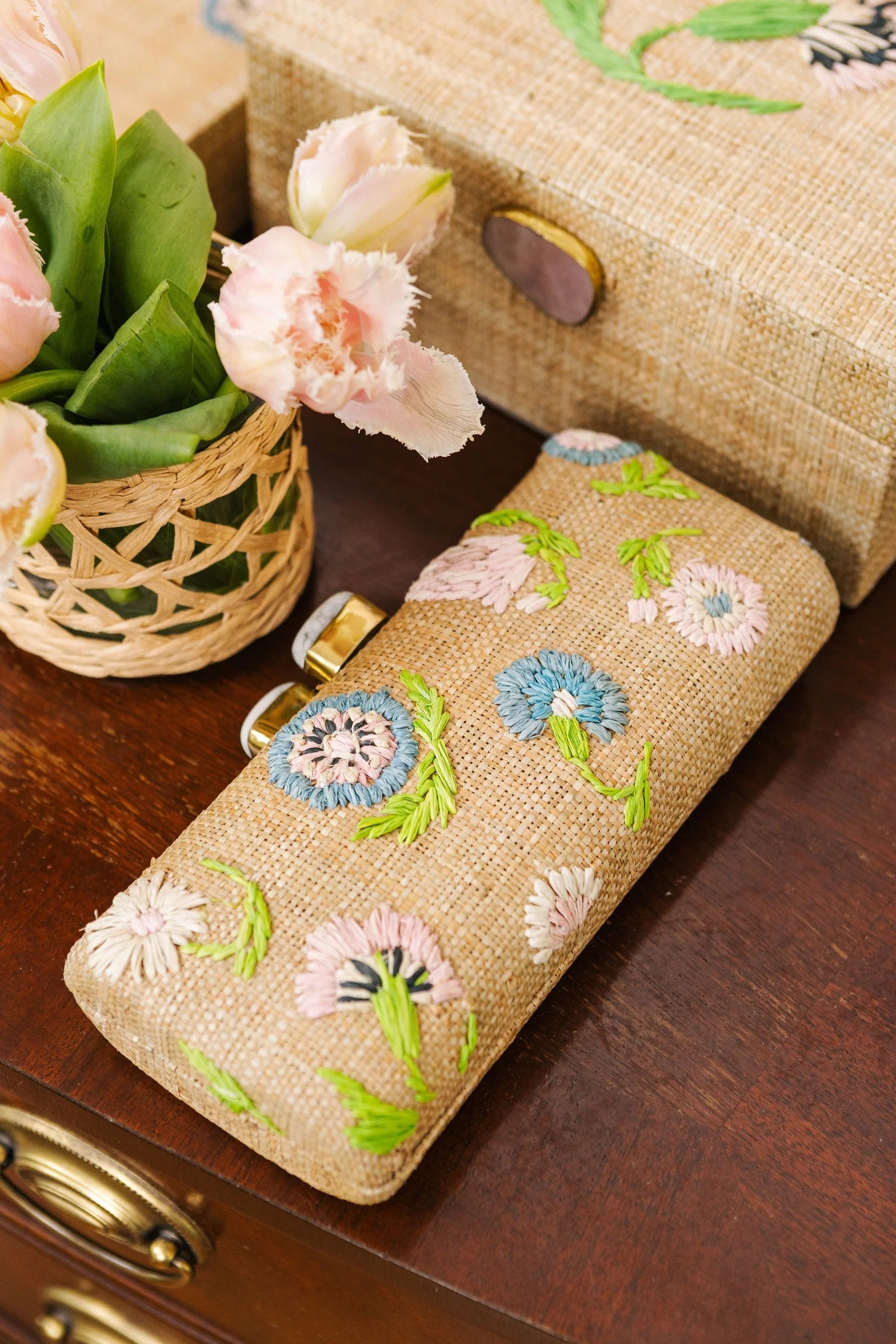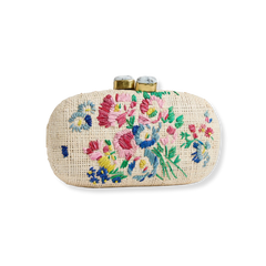 The Petite Fleur Minaudière is a romantic statement piece inspired by vintage tapestry florals and reimagined through intricate embroidery. Designed as part of a Valentine’s capsule collection, this structured straw clutch features delicate hand-embroidered blooms in soft pastel tones, blending texture and color with refined craftsmanship.