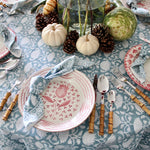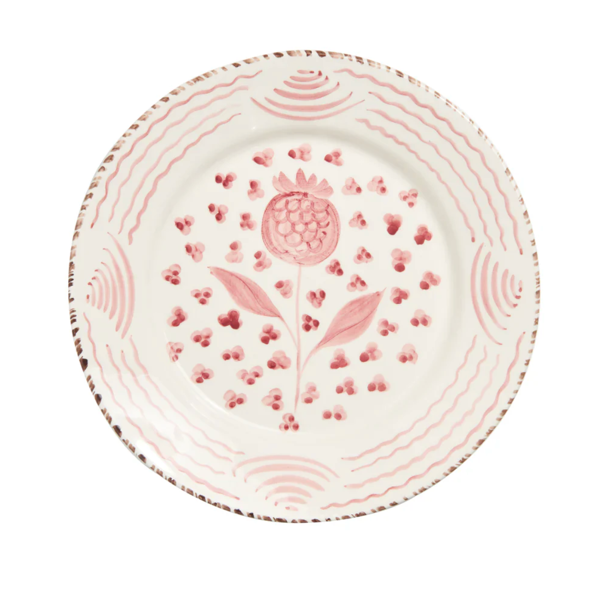 Introducing the Pomegranate and Waves Pink and White Dinner Plate: a chic and sophisticated piece crafted in Portugal with exquisite care, perfect for adding a touch of luxury to your dinner table. Its elegant floral and wave pattern, in a classic dusty pink and white color combination, is sure to transport your dinner setting to new heights of sophistication. Microwave and dishwasher safe. See special order note.