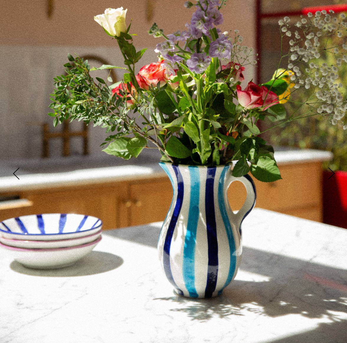 A handmade ceramic jug with bold stripes designed to bring sunshine & pleasure to your everyday. This Collection embraces the simple joys of Spanish life.