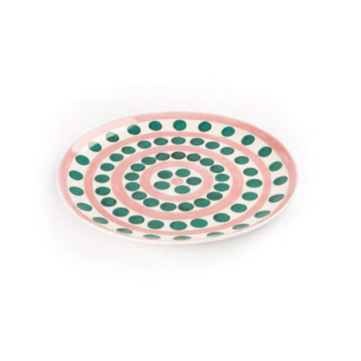 Pink and green have long been favorite colors of ours. These plates will add excitement and interest to any meal! This gorgeous pattern can stand alone or be used as part of a dinner set. Dishwasher and microwave safe. Made in Greece.