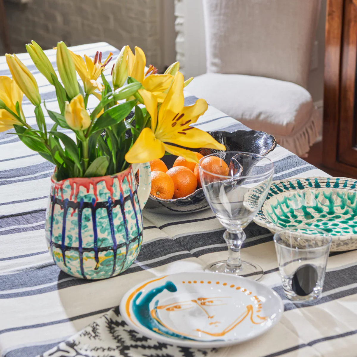 This hand-painted ceramic pitcher is great for serving your favorite beverages and looks great as a decor piece with some colorful flowers. Various shades of red, blue, black, green, and yellow create a pattern make this a very unique piece. Handmade in Puglia, Italy by a famous ceramics house.