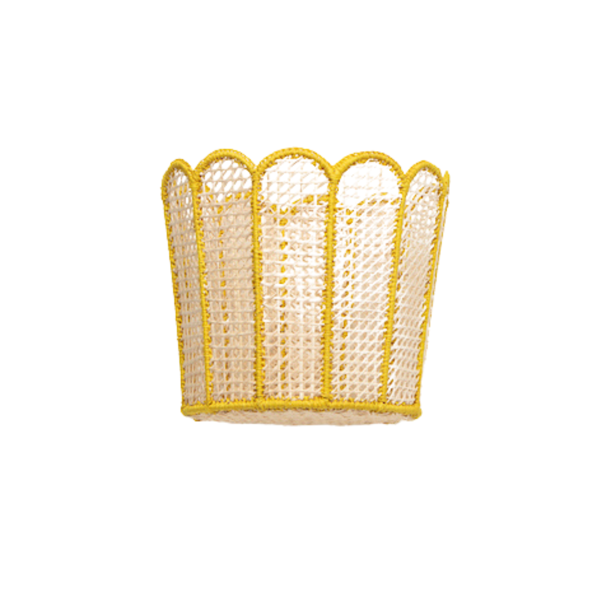Our Scalloped Arched Basket looks great holding your goodies, a plant or flowers. Includes a glass insert for when you want to use if for a floral arrangement. Think of it as a pretty way to coral the mess! Choose from rosey pink or yellow detail. Handwoven in Colombia.